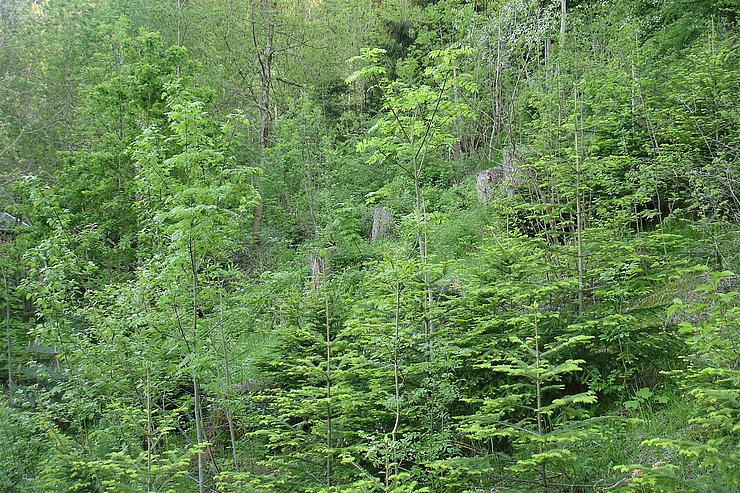 - Verjüngung mit Schatten ertragenden Baumarten wie Bergahorn, Weißtanne, Buche ist erfolgversprechender