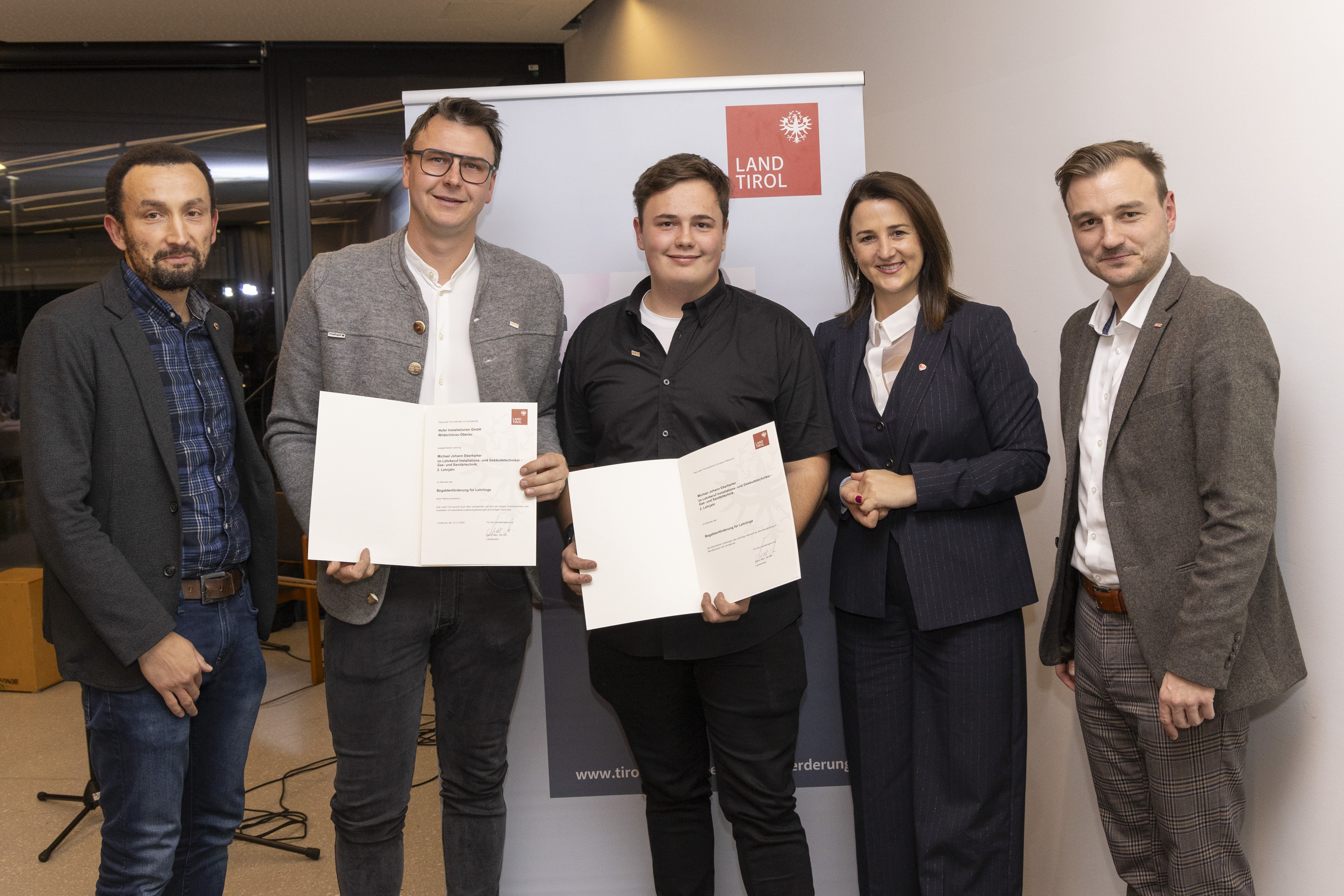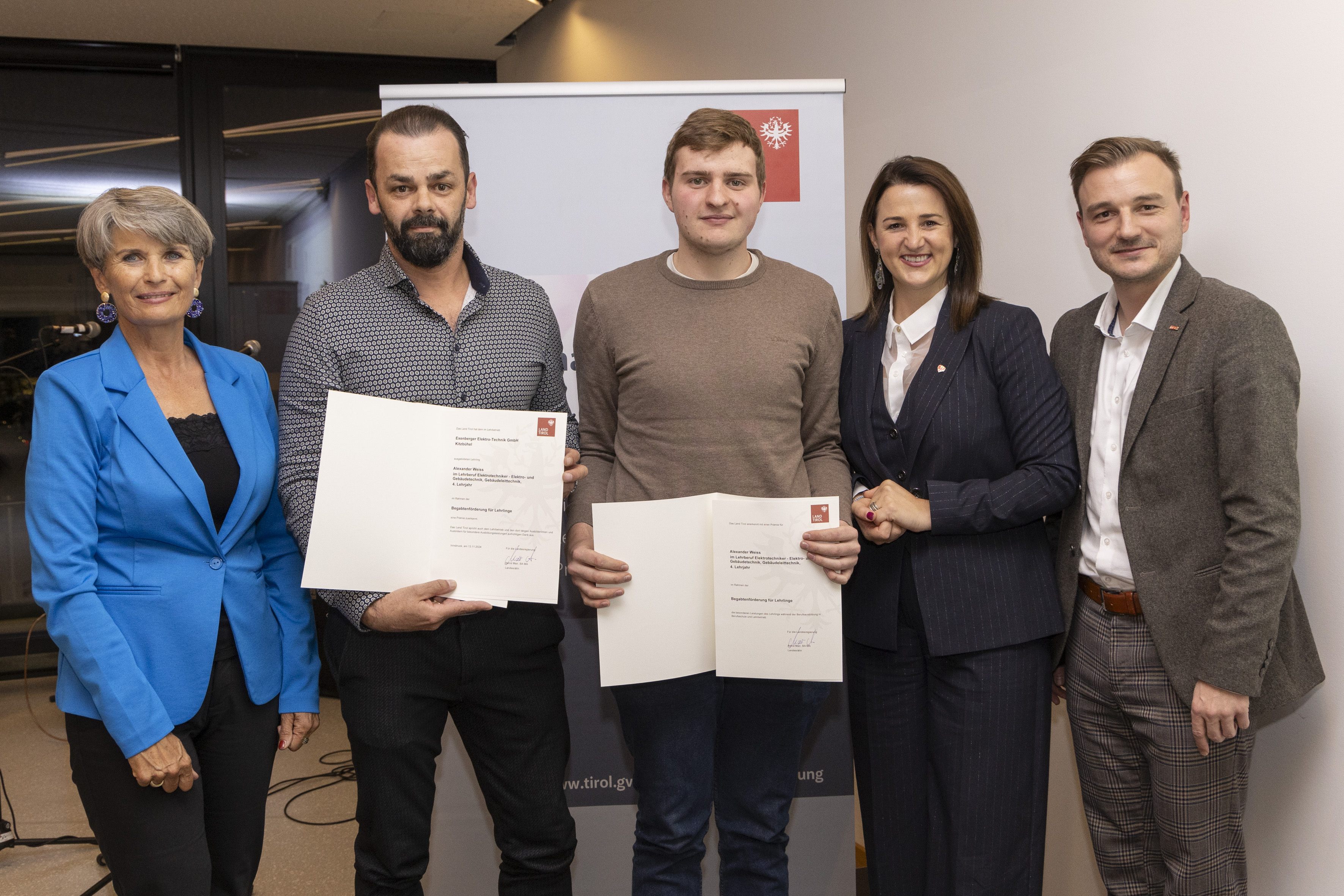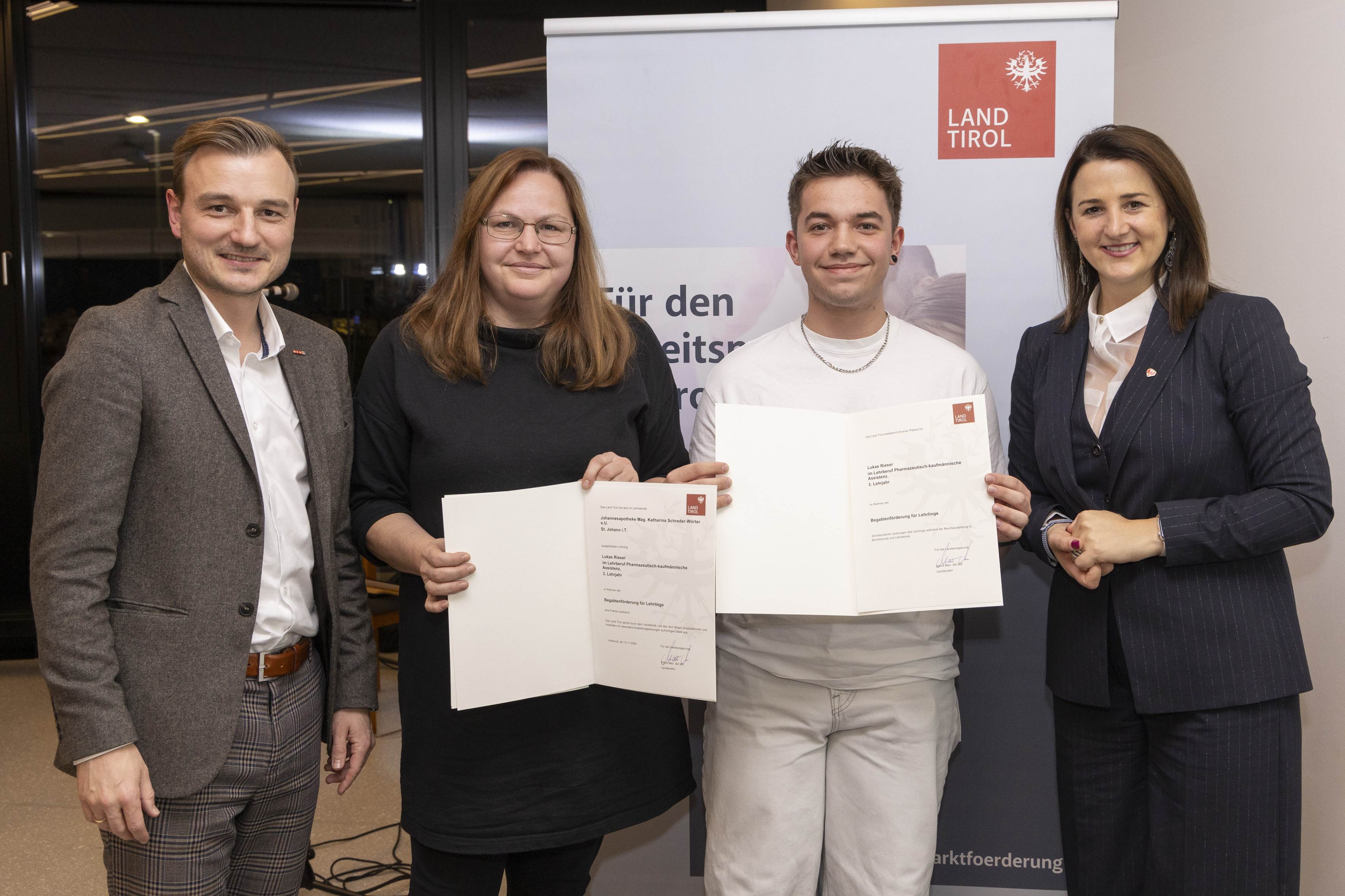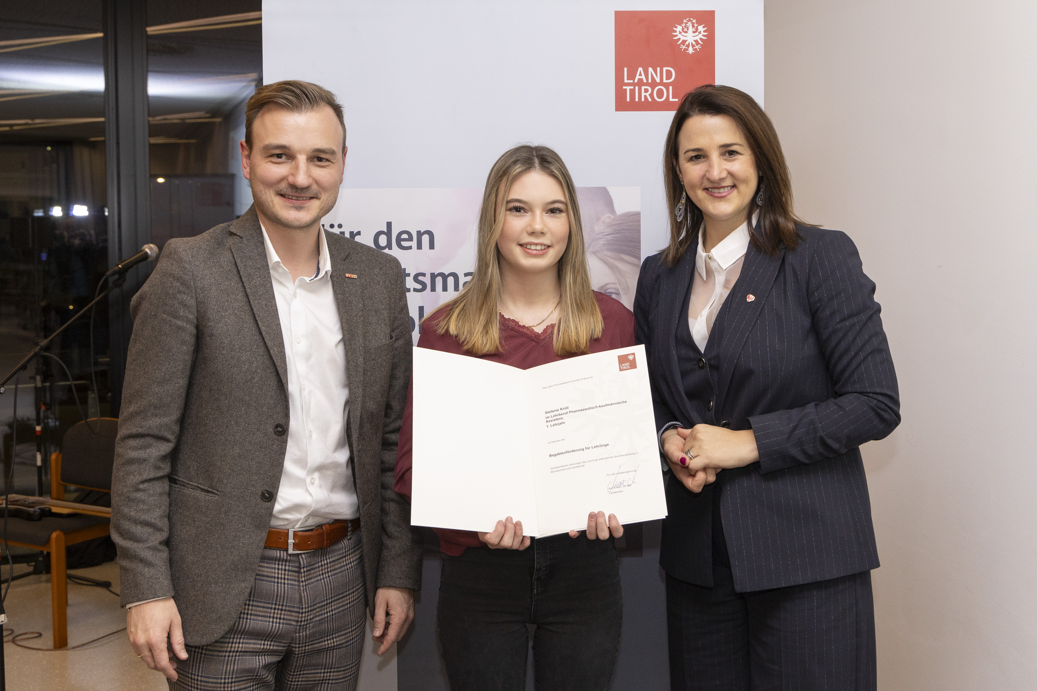 © Land Tirol/DieFotografenv.l.n.r.: LAbg. Martin Mayerl, Sabrina Steidl (Verwaltungsassistentin Gemeinde Innervillgraten 3. LJ), Dennis Pfeifhofer (Tischler bei Wieser Friedrich 3. LJ)© Land Tirol/DieFotografen