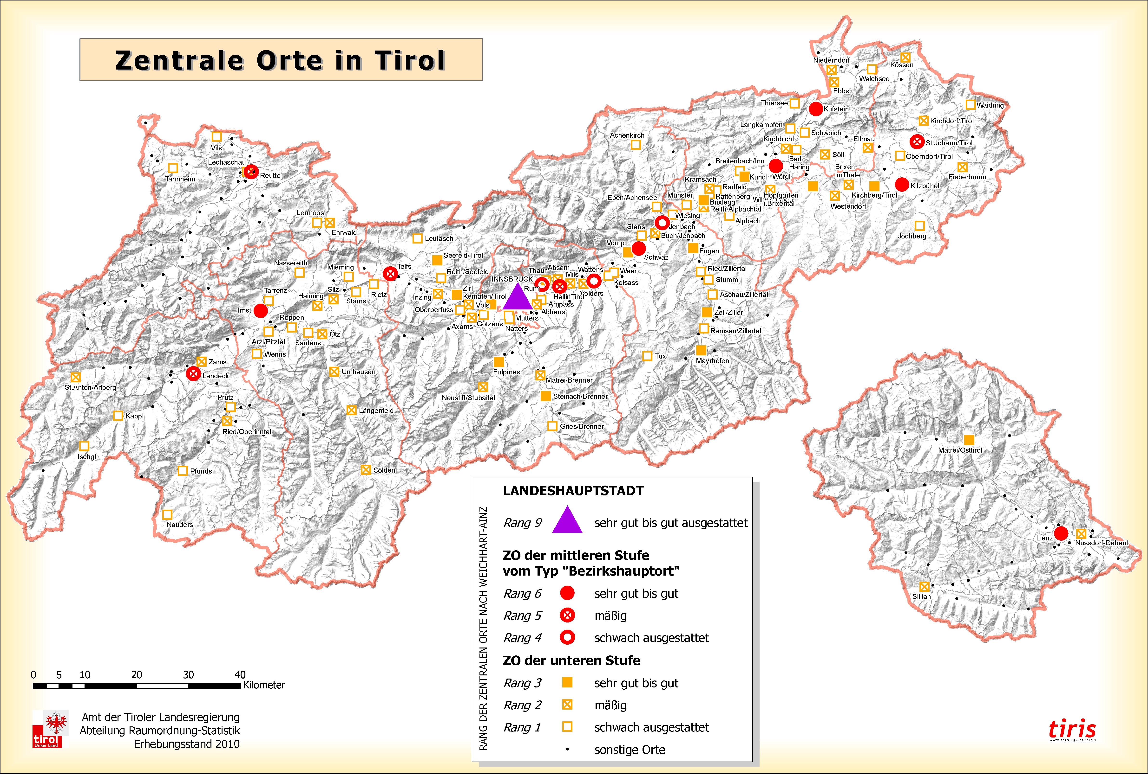 Die „Zentrale Orte Struktur“ in Tirol wurde im Jahr 2010 durch eine umfassende Untersuchung neu erhoben. Geprüft wurden alle 279 Tiroler Gemeinden. Die Ergebnisse der Studie zeigen für Tirol eine sehr dynamische Entwicklung.