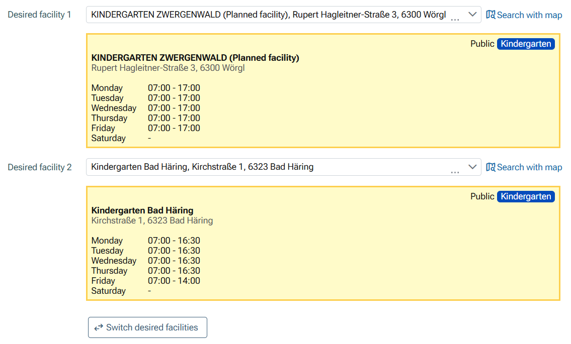 "Facility": Here, you specify the type of facility for which the child is being registered (crèche, nursery or after-school care) and whether the facility is to be private or public. After you have made your selection, another field will automatically open with "Preferred facility 1" and "Preferred facility 2". A personal preference can be stated for both. Note: After you select "public", the facility located closest your place of residence will automatically be entered as "Preferred facility 1". This does not necessarily have to be selected and can be adapted independently.