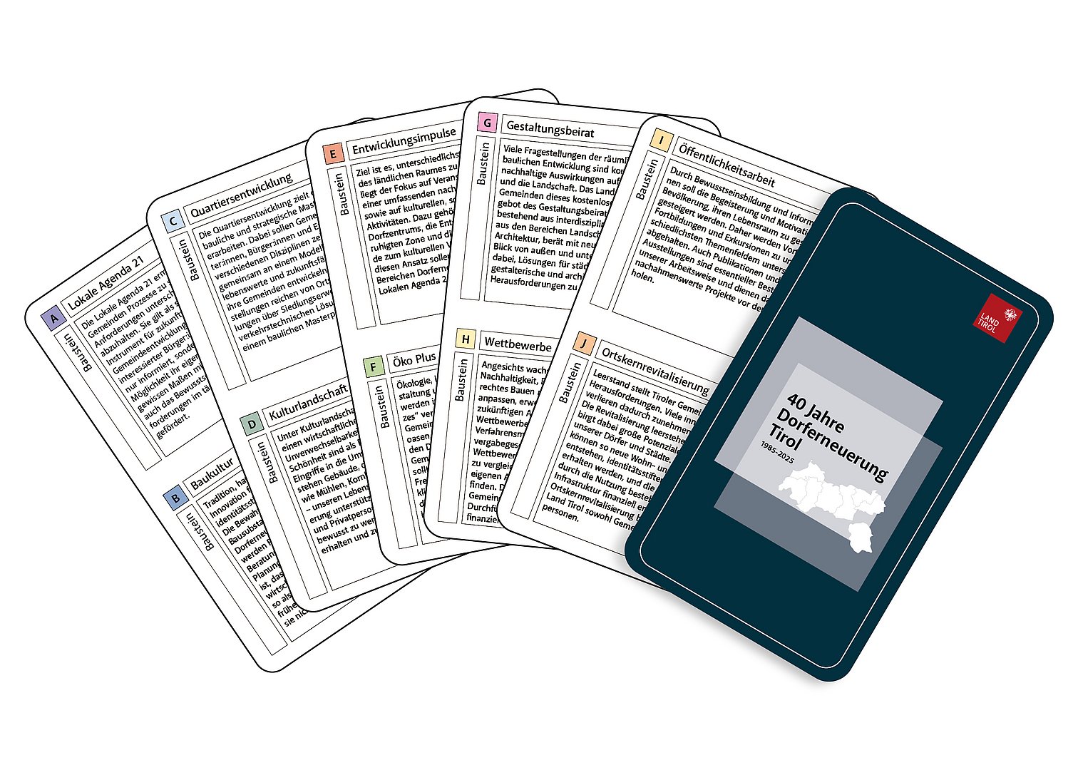 Anlässlich unseres 40-jährigen Bestehens haben wir ein Kartenspiel gestaltet, das 40 Highlights aus vier Jahrzehnten vorstellt – stellvertretend für die zahlreichen umgesetzten Projekte in den Tiroler Gemeinden.