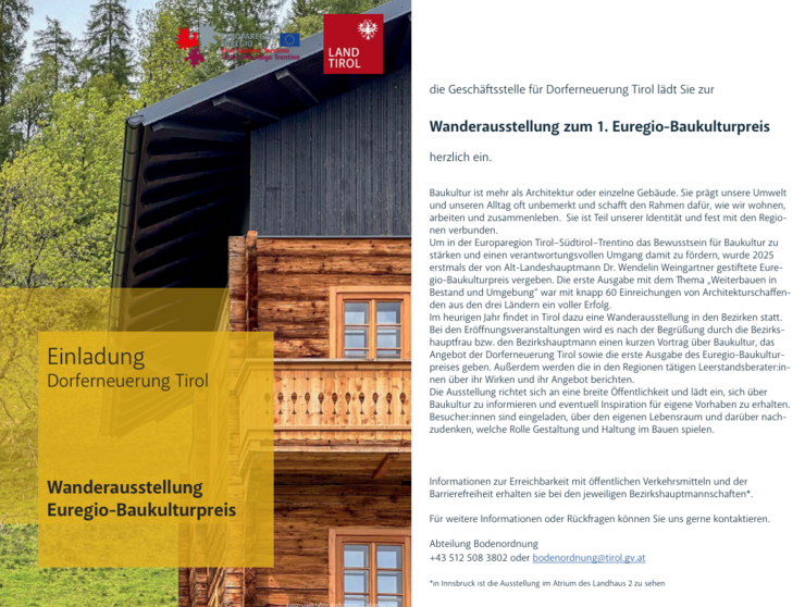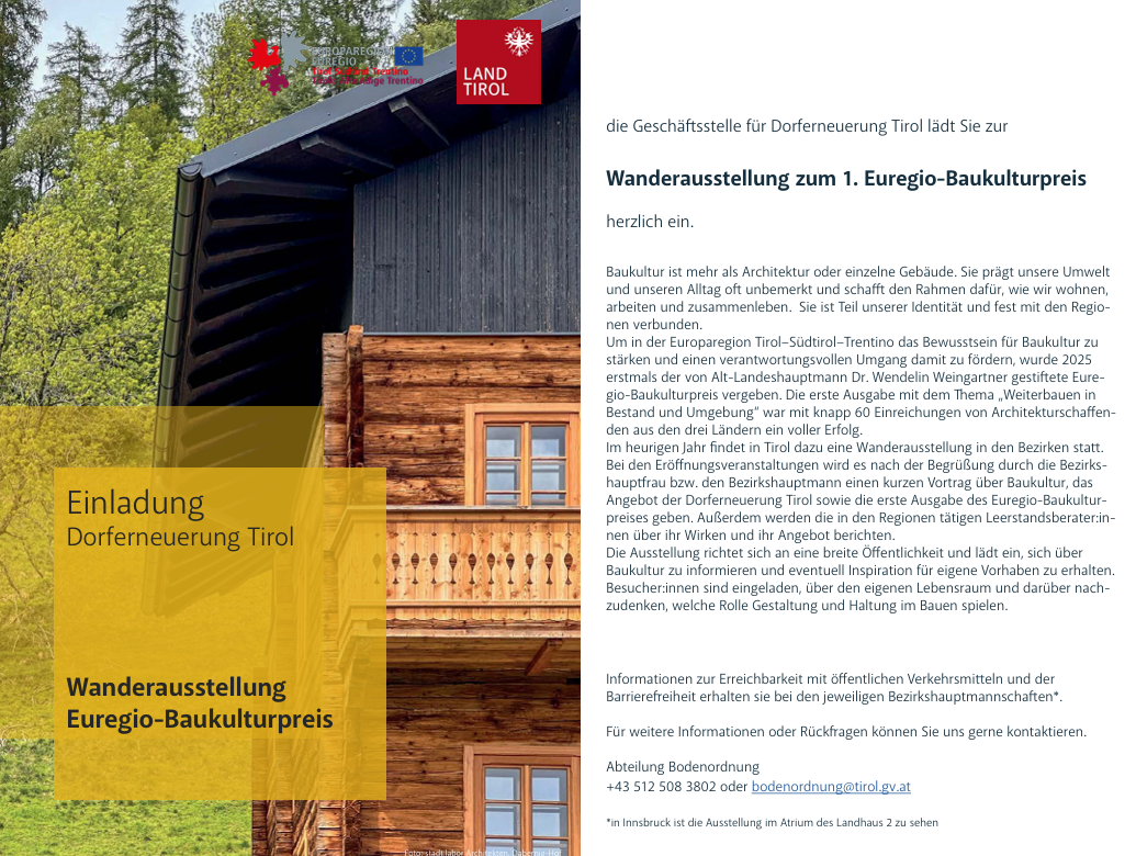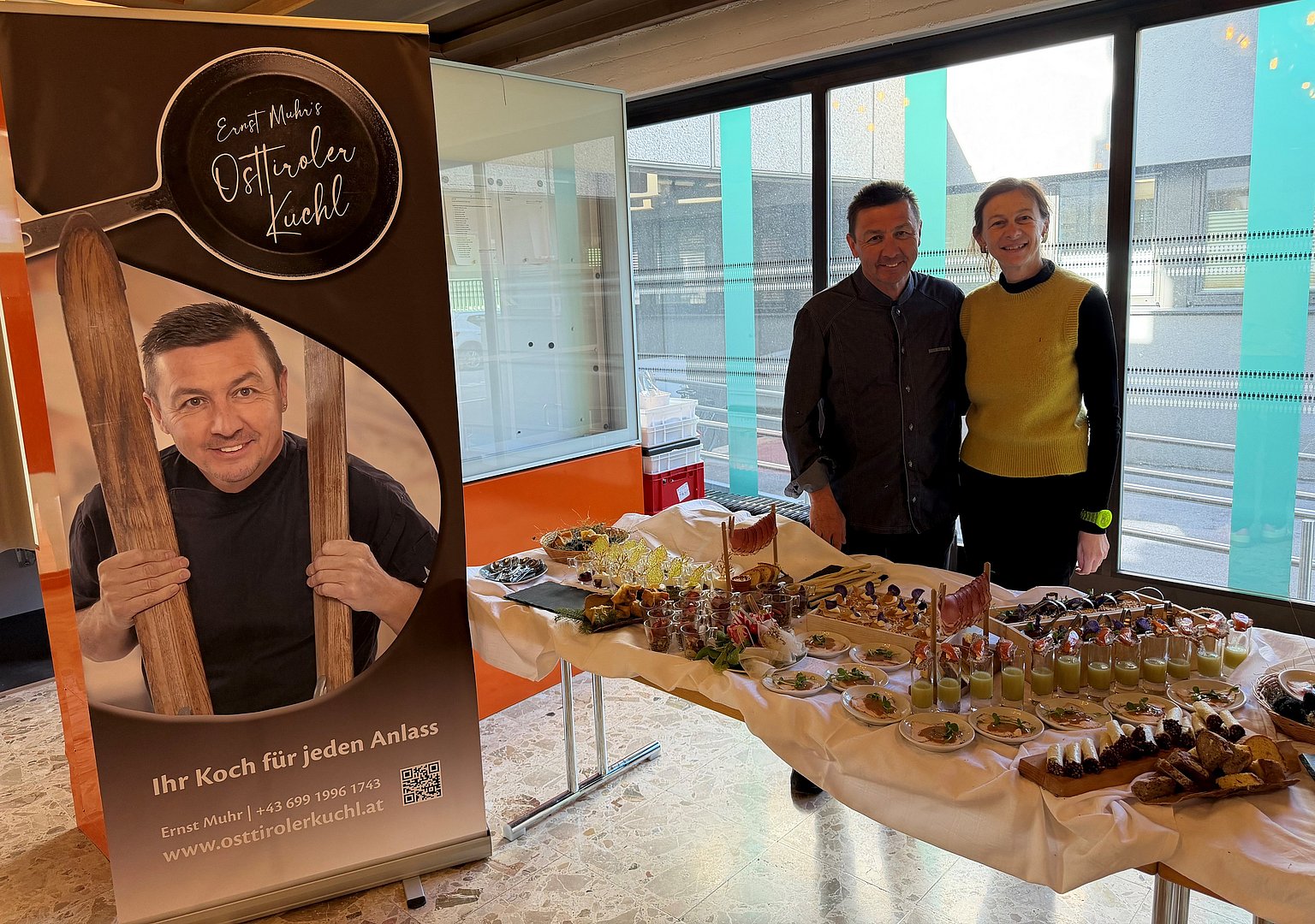 Eröffnung Wanderausstellung Euregio-Baukulturpreis mit feinen Köstlichkeiten von Ernst Muhr – der Besuch der Ausstellung im Eingangsbereich der Bezirkshauptmannschaft Lienz ist bis 10. April 2026 während der Öffnungszeiten möglich.