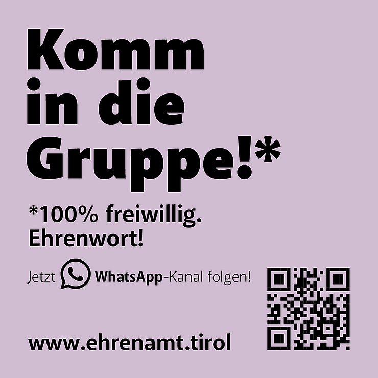 In den kommenden Wochen machen „Komm in die Gruppe“-Plakate in ganz Tirol neugierig und sollen Anreiz sein, sich mit dem Ehrenamt und der Freiwilligenarbeit auseinanderzusetzen. Während einerseits die starke Gruppe der (potentiellen) Ehrenamtlichen in den Fokus rückt, wird damit – bewusst doppeldeutig – auch der neue WhatsApp-Kanal des Landes beworben: Zu erreichen über www.ehrenamt.tirol wird dort laufend über Neuigkeiten, aktuelle Freiwilligenprojekte, Möglichkeiten für freiwilliges Engagement in Tirols Regionen, Veranstaltungen, Weiterbildungsmöglichkeiten und Vorteile für Ehrenamtliche und Freiwillige informiert.