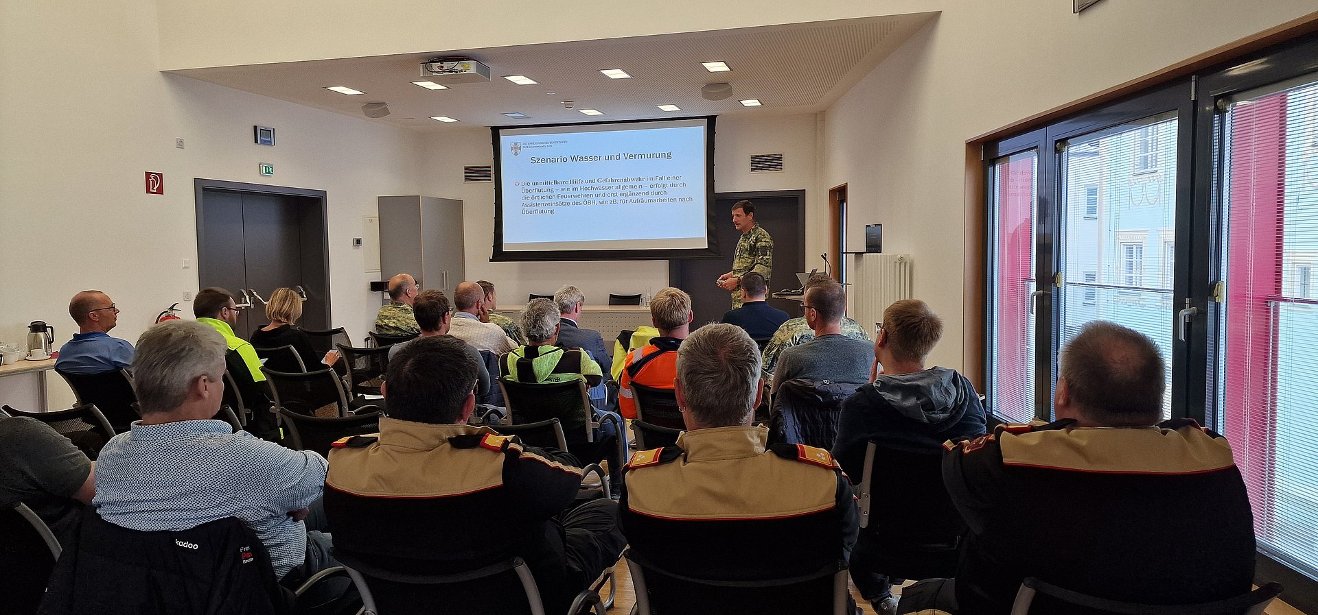 Welche Aufgaben das Bundesheer im Ernstfall übernehmen kann, wie solche Assistenzeinsätze korrekt angefordert werden und wie die Zusammenarbeit am besten funktioniert waren Themen eines Vortrages von Vertretern des Militärkommandos Tirol an der Bezirkshauptmannschaft Reutte diese Woche. An der Veranstaltung nahmen neben Mitgliedern der Bezirkseinsatzleitung Reutte auch MitarbeiterInnen des Baubezirksamts Reutte sowie VertreterInnen der Wildbach- und Lawinenverbauung Außerfern, der Elektrizitätswerke Reutte und des Bezirksfeuerwehrverbands Reutte teil.