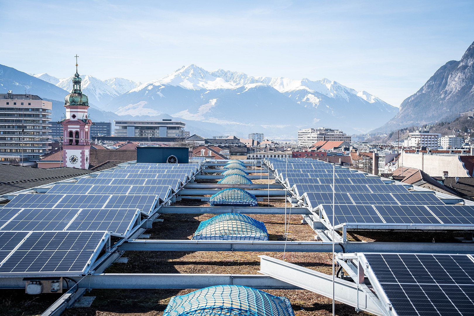 Das Thema Energie spielt für das Land Tirol eine zentrale Rolle. Damit Tirol unabhängig von fossilen Energieträgern und Importen aus dem Ausland werden kann, muss mehr erneuerbare Energie im Land erzeugt werden. Gleichzeitig gilt es, den Energieverbrauch zu reduzieren. Für die Landesverwaltung heißt das: Alle neu errichteten oder sanierten Landesgebäude werden mit PV-Anlagen ausgestattet. Bisher wurden mehr als 50 PV-Anlagen auf Landesgebäuden mit einer Gesamtfläche von über 23.300 Quadratmetern Flächen installiert – eine Fläche so groß wie drei Fußballfelder. Die Gesamtleistung von 4.100 Kilowatt-Peak entspricht einem Jahresstromverbrauch von beinahe 1.000 durchschnittlichen österreichischen Haushalten. Mit der Gründung einer eigenen Energiegemeinschaft haben das Land Tirol und TINEXT zudem einen weiteren Schritt in Richtung Energieautonomie gesetzt. Dadurch können Überschüsse der PV-Anlagen, die nicht vor Ort verbraucht werden, zur Versorgung anderer landeseigener Gebäude genutzt werden.