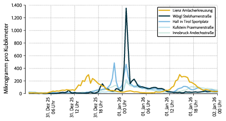 Im ganzen Land konnte man in der Silvesternacht wieder zahlreiche Feuerwerke am Himmel sehen. Raketen und Böller erhöhen die Feinstaubbelastung jedes Jahr zum Jahreswechsel. An insgesamt elf Messstellen in Tirol werden die Luftgütewerte im Hinblick auf Feinstaub ständig überwacht. Bereits letztes Jahr kam es aufgrund der Wetterlage zu deutlichen Überschreitungen der Grenzwerte. In den Jahren davor gab es einen abnehmenden Trend. Zum Jahreswechsel 2024/2025 wurde der im Immissionsschutzgesetz-Luft festgelegte Grenzwert zum Schutz der menschlichen Gesundheit von 50 µg pro Kubikmeter im Tagesmittel an mehreren Messstellen deutlich überschritten. Dies war auch beim heurigen Jahreswechsel der Fall: Laut den ExpertInnen der Abteilung Waldschutz des Landes Tirol war dafür unter anderem die trockene Wetterlage mit relativ windschwachen Verhältnissen um Mitternacht mitverantwortlich. Der höchste Feinstaubmesswert am 1. Jänner 2026 im Tagesmittel wurde mit 111 µg pro Kubikmeter an der Messstelle Wörgl Stelzhamerstraße gemessen. Ebenfalls sehr hohe Werte wurden in Innsbruck, Hall, Kufstein und Lienz festgestellt. „Die gemessene Feinstaubbelastung rund um den Jahreswechsel zeigt einmal mehr, wie sehr die Feuerwerke in nur einer einzigen Nacht unsere Luft negativ beeinflussen. Die heurige Bilanz fällt leider unerfreulich aus. Die Feuerwerke belasten letztlich nicht nur die Luft, sondern verschmutzen auch langfristig Böden und Gewässer“, resümiert Umweltschutzlandesrat Zumtobel.