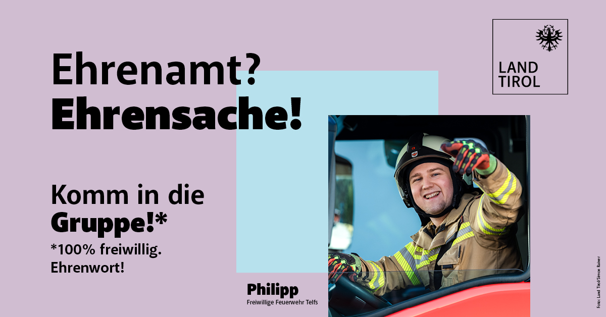 Lisa von der Musikkapelle Thurn in Osttirol, Hildegard vom Stadttheater Kufstein, Philipp von der Freiwilligen Feuerwehr Telfs, Waltraud vom „Straxi“ – Personentaxi Strass im Zillertal, Jana und Resi von der Pfadfinder-Gruppe Zirl, Lisi vom Caritas-Zentrum in Uderns, Willi von der Vinzenzgemeinschaft Hall-St. Nikolaus und Peter vom Riefenlift in Zams: Das sind die Gesichter der zweiten Phase der Kampagne „Komm in die Gruppe! Ehrenamt? Ehrensache!“ und bilden einen Teil des in Summe noch viel breiteren Spektrums der unbezahlbaren Ehrenamts- und Freiwilligenarbeit in Tirol ab. Sie alle werden auf Plakaten in Tirol sowie teils auch als Bewegtbild zu sehen sein. Welcher Clip diese Woche als erstes online ausgestrahlt wird, darüber entschied die WhatsApp-Gruppe „Ehrenamt Tirol“ www.ehrenamt.tirol: In einer Abstimmung erhielt der Bereich Sicherheit mit der Feuerwehr am meisten Stimmen – dieser Clip wird damit ab heute online veröffentlicht und steht unter anderem auf dem YouTube-Kanal des Landes zur Verfügung. Die weiteren folgen in den kommenden Tagen. Die im Zuge des „Jahr des Ehrenamts“ eigens eingerichtete WhatsApp-Gruppe, die auch langfristig über das Jahr 2026 hinaus weiter Bestand haben soll, zählt mittlerweile über 2.300 Mitglieder – ein Erfolg für Kampagne.