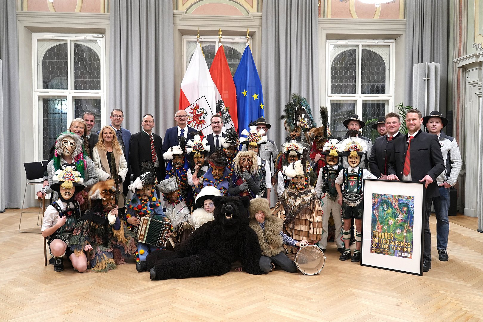 Mit Zottler, Melcher und Hexen zog die Fasnacht erneut ins Landhaus ein: Nach mehreren Brauchtumsgruppen aus Tirol präsentierten sich nun die Thaurer Jungmuller und luden Landeshauptmann Anton Mattle sowie die Landesregierung zum heurigen Thaurer Mullerlauf am 8. Februar ein. Die Kinder und Jugendlichen gaben einen lebendigen Vorgeschmack auf das bunte Treiben der Fasnacht.