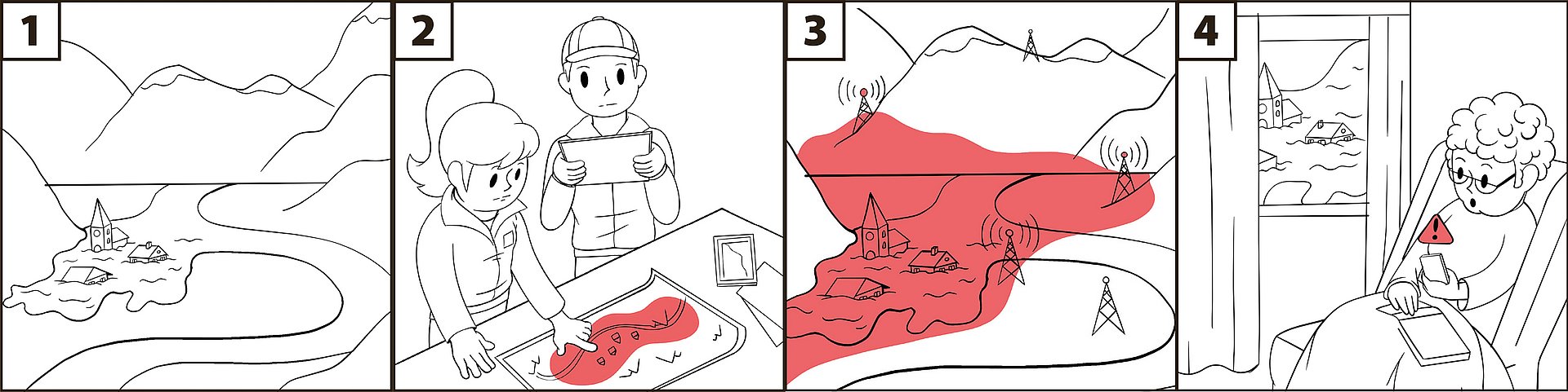 - Gefahr wird erkannt: Die Behörde erhält die Information über eine Gefahr – beispielsweise eine Naturgefahr (etwa ein Hochwasser) – und entscheidet über die Auslösung von AT-Alert (und die Warnstufe).