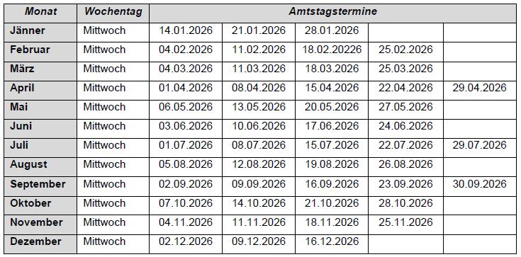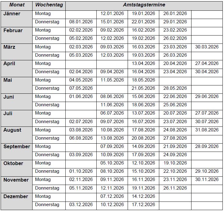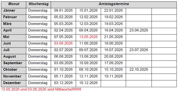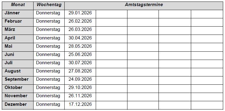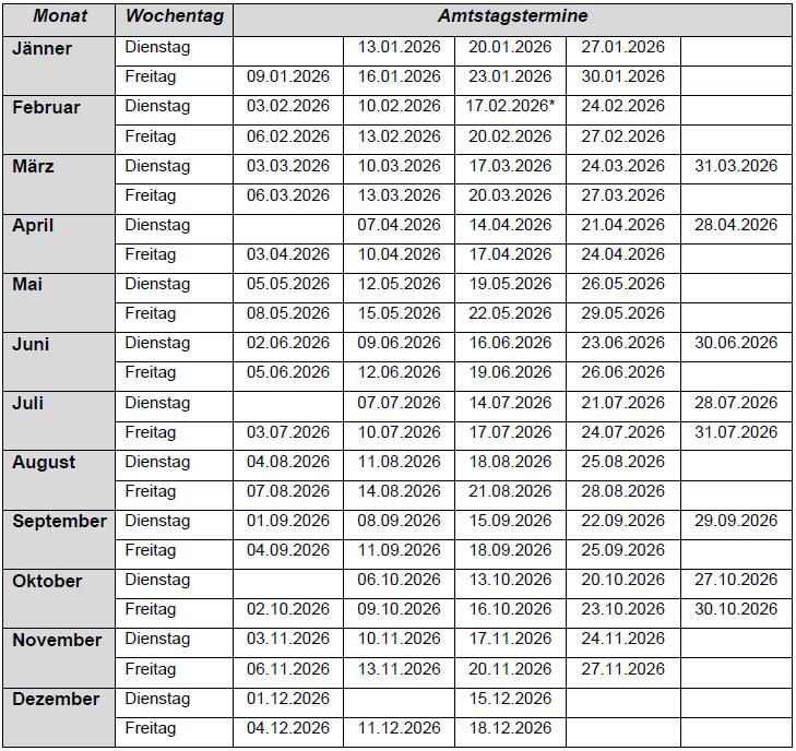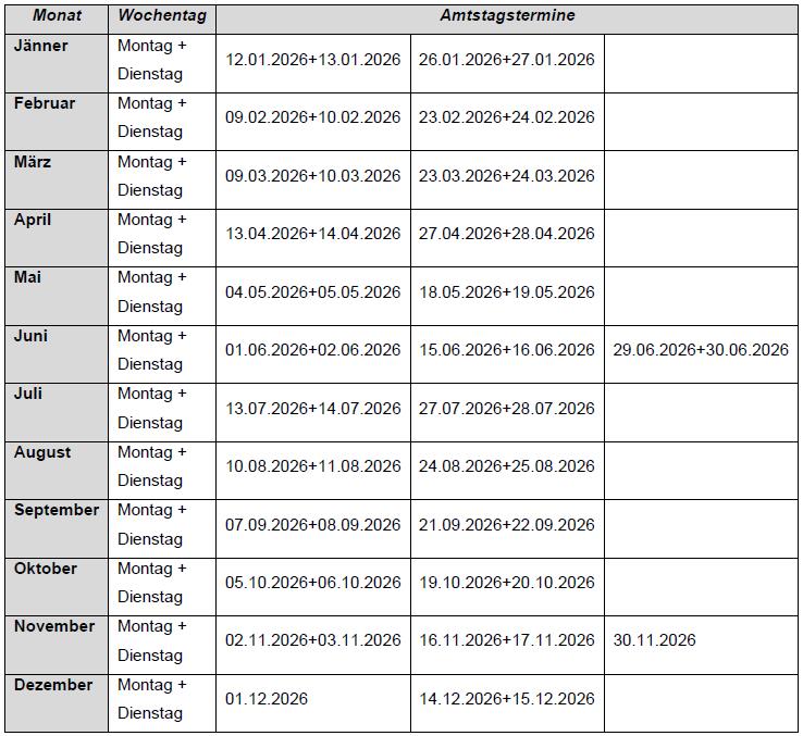 Prüftage: Kalender 2025Kalender2026 - Bezirk Lienz: